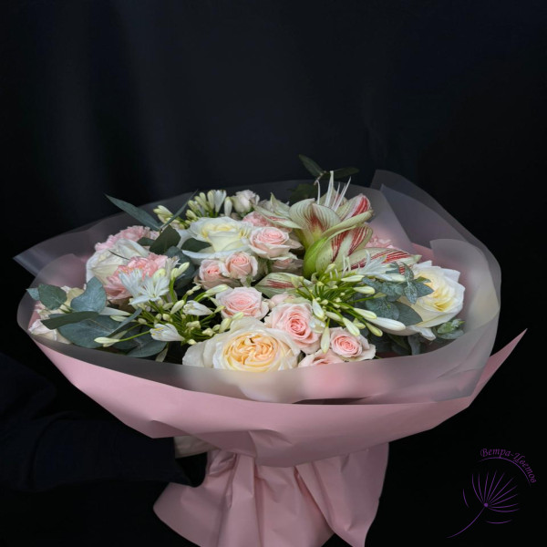 Состав : Амарилис-1шт Кустовая роза-5шт Диантус-5 шт Эвкалипт-4 ветки Агапантус-3шт Роза Кенди Лайт-5шт Флористическая упаковка Лента